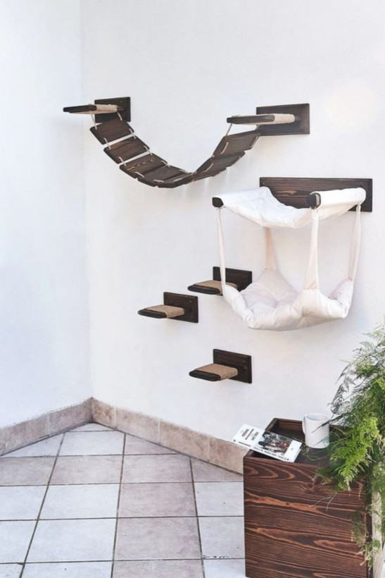 این مجموعه دیواری، یک فضای ایدهآل برای گربههای ماجراجو و پرانرژی است. طراحی آن شامل یک پل معلق چوبی، نردبان دیواری و یک تخت معلق راحت است که به گربهها امکان حرکت، بازی و استراحت را در ارتفاع میدهد.